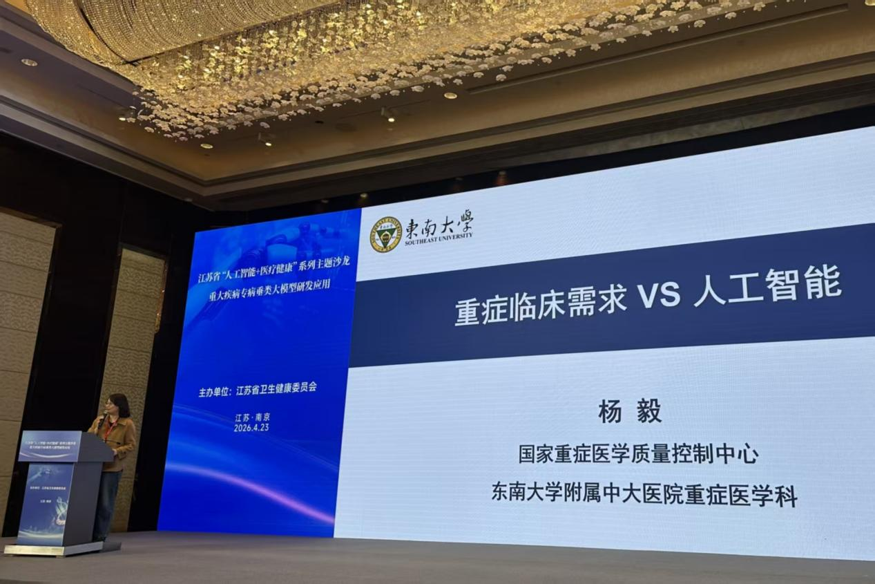 4月23日,江苏省“人工智能+医疗健康”系列主题沙龙——重大疾病专病垂类大模型研发应用专场在南京举行。国家重症医学质量控制中心主任、东南大学附属中大医院重症医学科主任杨毅教授受邀作主旨演讲,并参与圆桌论坛,围绕重症医学与人工智能深度融合的前沿思考与一线经验,为江苏“人工智能+医疗健康”创新发展建言献策。